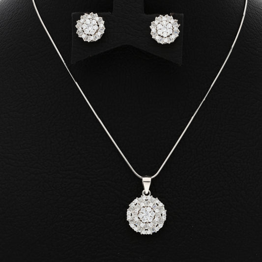 Sterling Silver 925 Round Flower Shaped Pendant Set (Necklace & Earrings) - FKJNKLSTSL9461