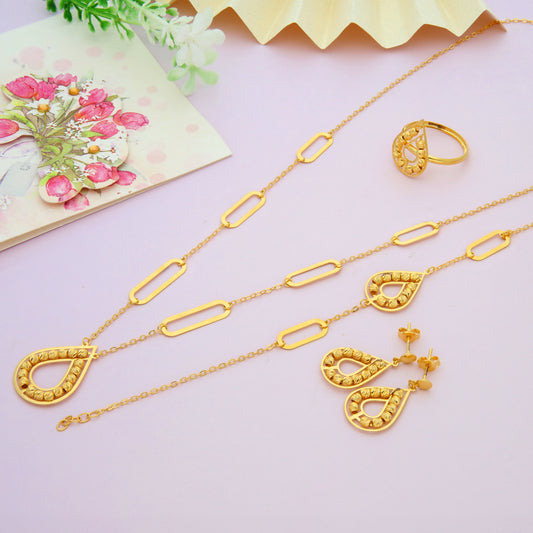 Gold Hanging Tear Drop Shaped Pendant Set (Necklace, Bracelet, Earrings and Ring) 21KT - FKJNKLST21KM9857