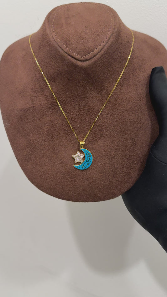 Gold Necklace (Chain with Star & Crescent Turquoise Moon Pendant) 21KT - FKJNKL21KM10203