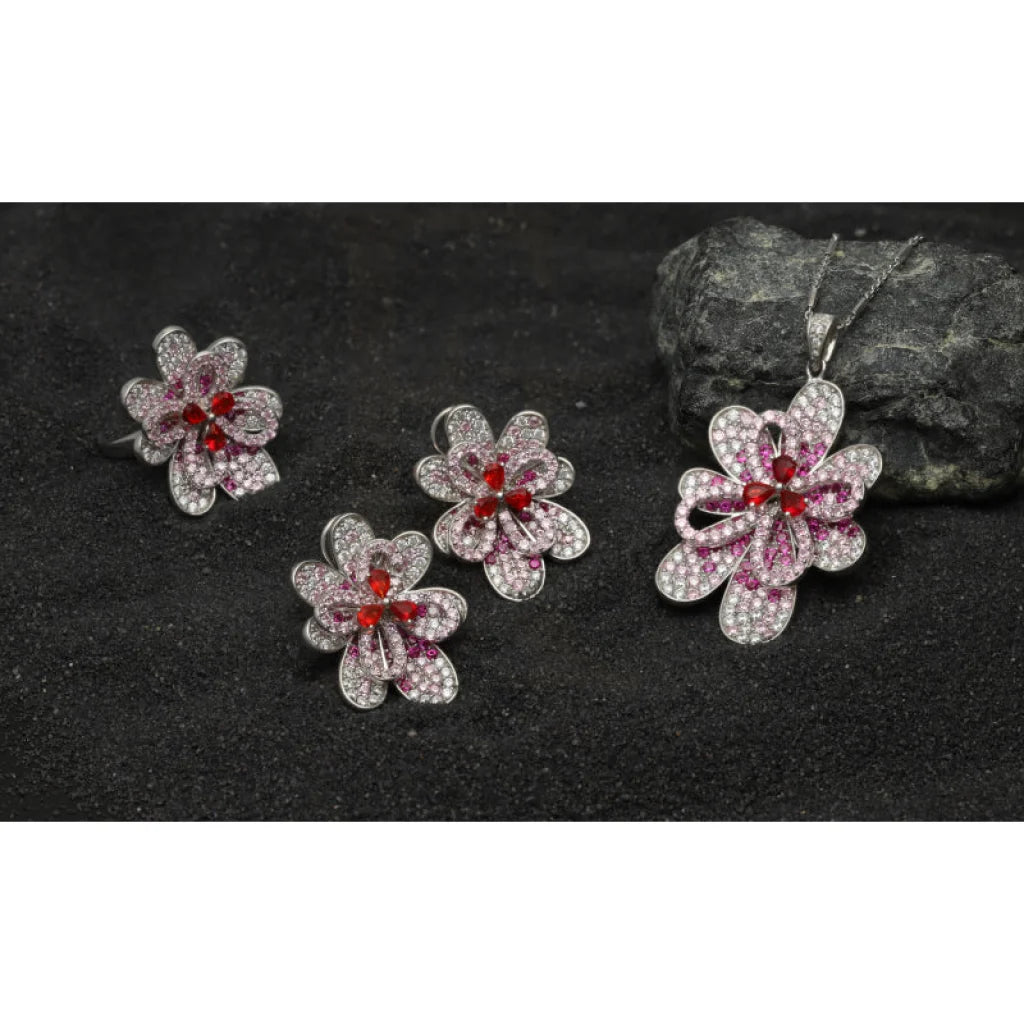 Sterling Silver 925 Blooming Flower Pendant Set (Necklace, Earrings and Ring) - FKJNKLST1920