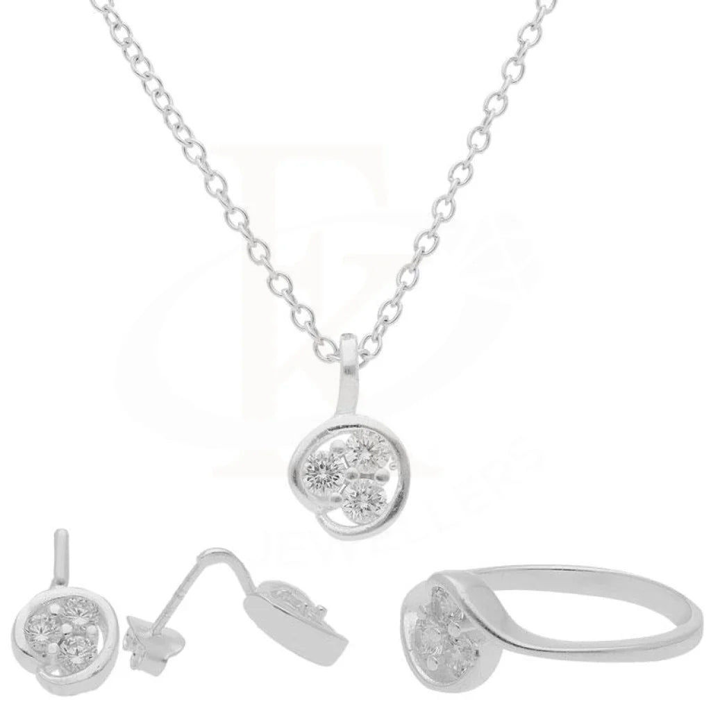 Sterling Silver 925 Triple Solitaire Pendant Set (Necklace, Earrings and Ring) - FKJNKLST2025